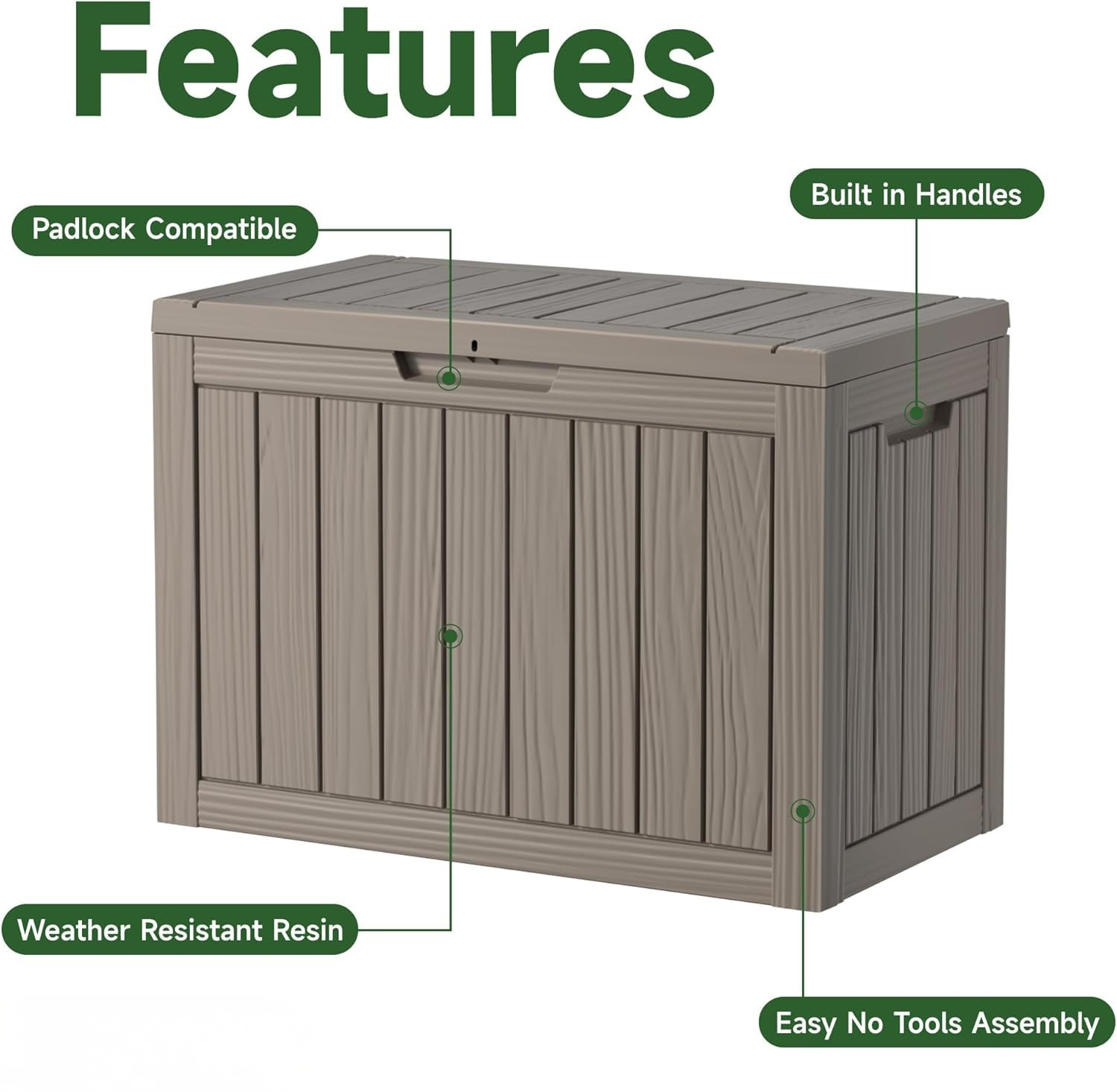 No tools required. The smart snap-together design allows you to assemble your outdoor deck box in approximately 30–35 minutes. Integrated side handles make repositioning simple and hassle-free.