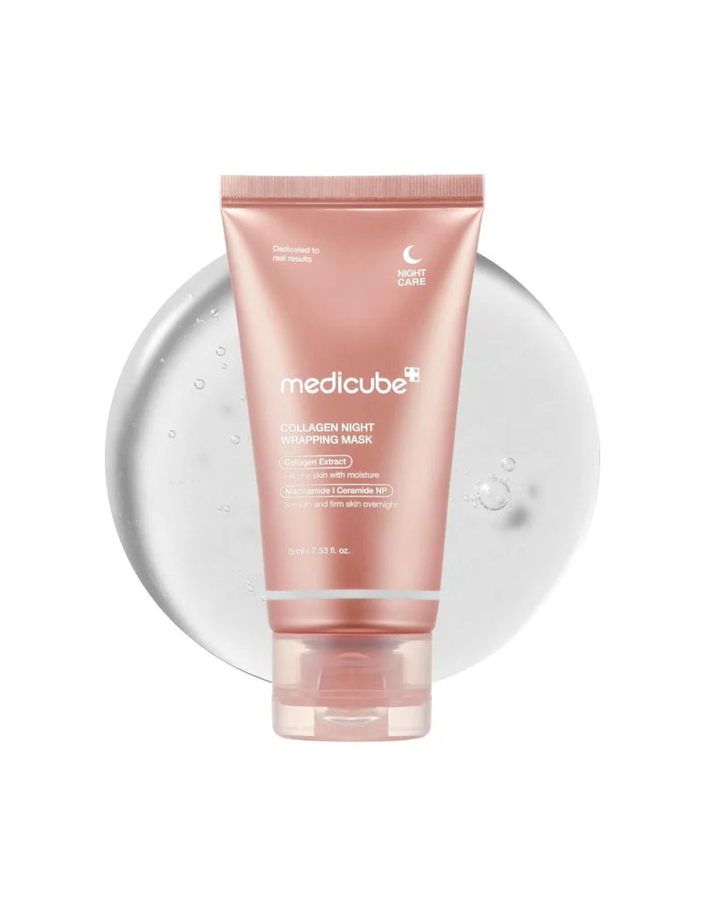 Experience the secret to firmer, deeply hydrated glass skin with the Medicube Collagen Night Wrapping Mask. This advanced overnight mask works while you sleep, creating a breathable, moisture-sealing film that locks in active ingredients and promotes overnight skin recovery. Infused with Collagen Extract, Ceramide NP, and antioxidant-rich Vitamin E, it visibly enhances elasticity, smooths fine lines, and restores a youthful bounce by morning — your shortcut to glass skin in a tube.