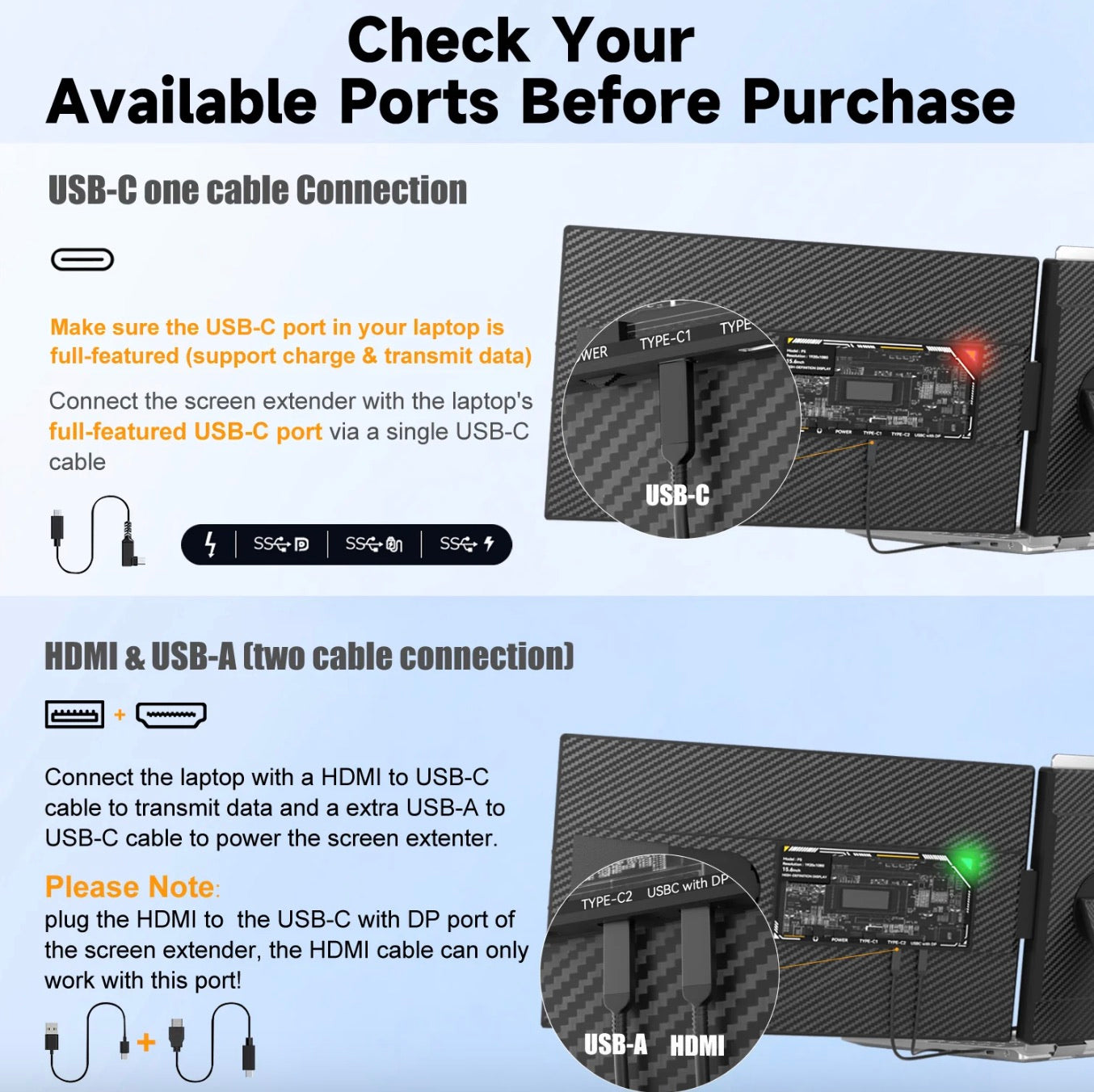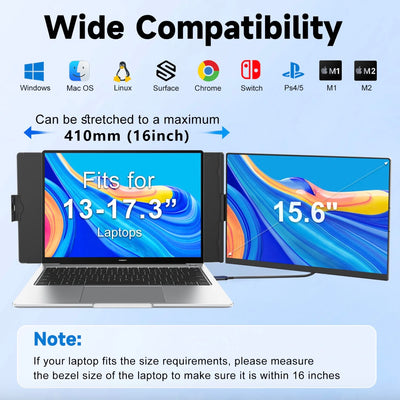 Transform the way you work and play with the P5 15.6” Dual Laptop Screen Extender—your ultimate tool for next-level productivity and entertainment. Whether you're a multitasking professional, a creative mind, or a gamer craving more screen space, this ultra-slim, high-definition display enhances your workflow with stunning clarity and seamless functionality. Designed for flexibility, this lightweight, detachable monitor offers an immersive viewing experience with vibrant colors and seamless connectivity, making it the perfect companion for work and entertainment on the go.